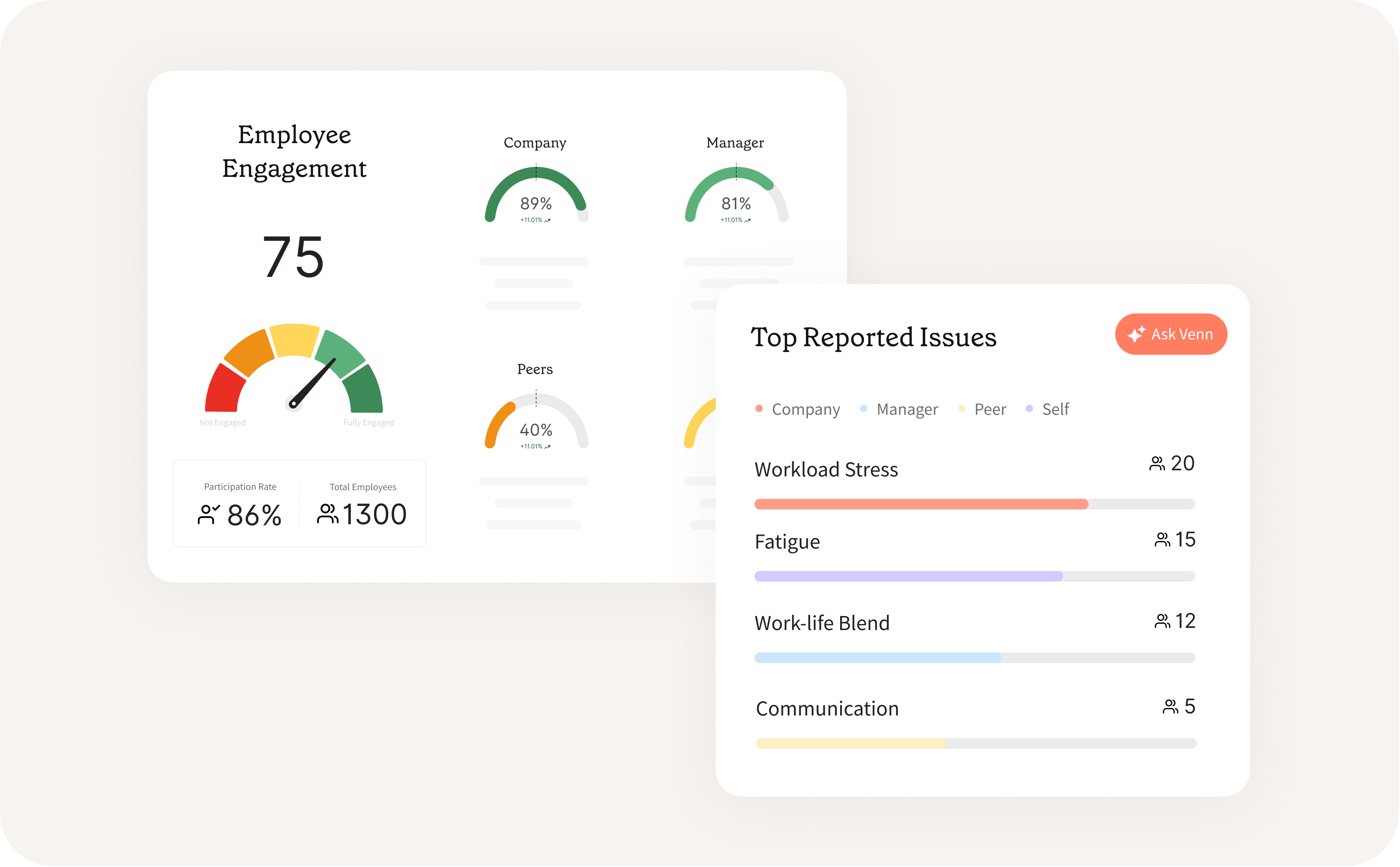 Venn, your AI-powered culture partner, has judgment-free conversations with every employee about workload, wellbeing, blockers, and team dynamics. Don't worry this is not a big brother that is continually listening. You choose the cadence based on your business needs. Your employees get notified in Slack or Teams when its time for them to share their thoughts.